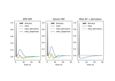 nilearn.glm.first_level.spm_hrf, andnilearn.glm.first_level.spm_time_derivative.“spm + derivative + dispersion”: Idem, plus dispersion derivative. This gives 3 regressors. See